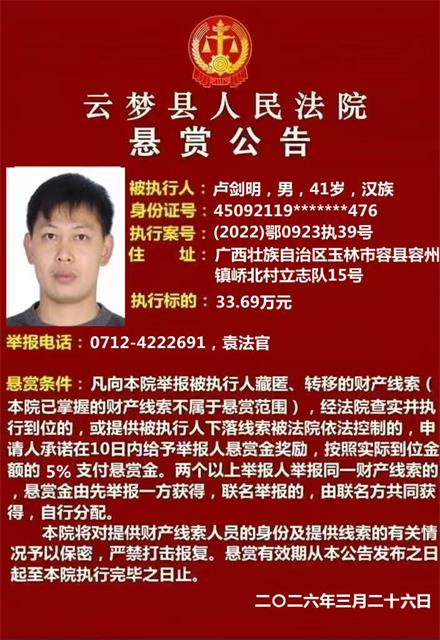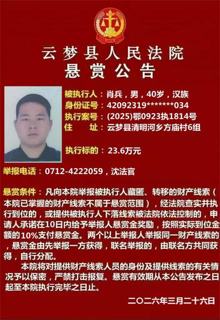 【举报有奖】云梦法院执行悬赏公告(2026年第3期)